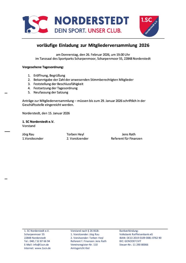 Liebe Mitglieder, wir laden ein zur Mitgliederversammlung, am Donnerstag, den 26.02.2026, um 19.00 Uhr. Näheres entnehmt ihr bitte der Einladung. Stand: 15.01.2026